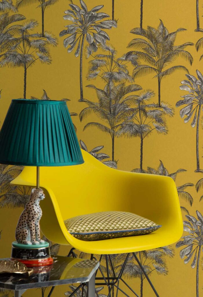 Una disposición equilibrada de palmeras, como las que se encuentran en los bosques prístinos de la isla principal, Unguja, adorna este papel pintado. El delicado patrón está disponible en mate de dos colores y en mate/brillante multicolor. Los detalles de color muestran PALM BOUQUET en amarillo azafrán, índigo lavado a la piedra, verde esmeralda y rojo coral, cada uno con cautivadores colores de acento.