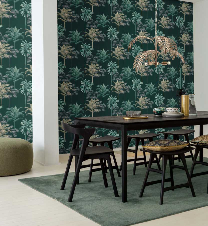 Una disposición equilibrada de palmeras, como las que se encuentran en los bosques prístinos de la isla principal, Unguja, adorna este papel pintado. El delicado patrón está disponible en mate de dos colores y en mate/brillante multicolor. Los detalles de color muestran PALM BOUQUET en amarillo azafrán, índigo lavado a la piedra, verde esmeralda y rojo coral, cada uno con cautivadores colores de acento.
