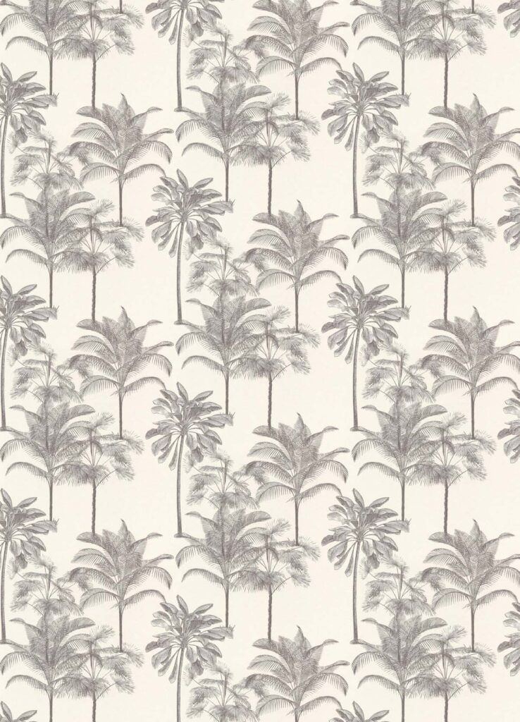 Una disposición equilibrada de palmeras, como las que se encuentran en los bosques prístinos de la isla principal, Unguja, adorna este papel pintado. El delicado patrón está disponible en mate de dos colores y en mate/brillante multicolor. Los detalles de color muestran PALM BOUQUET en amarillo azafrán, índigo lavado a la piedra, verde esmeralda y rojo coral, cada uno con cautivadores colores de acento.