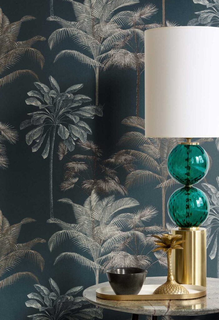 Una disposición equilibrada de palmeras, como las que se encuentran en los bosques prístinos de la isla principal, Unguja, adorna este papel pintado. El delicado patrón está disponible en mate de dos colores y en mate/brillante multicolor. Los detalles de color muestran PALM BOUQUET en amarillo azafrán, índigo lavado a la piedra, verde esmeralda y rojo coral, cada uno con cautivadores colores de acento.
