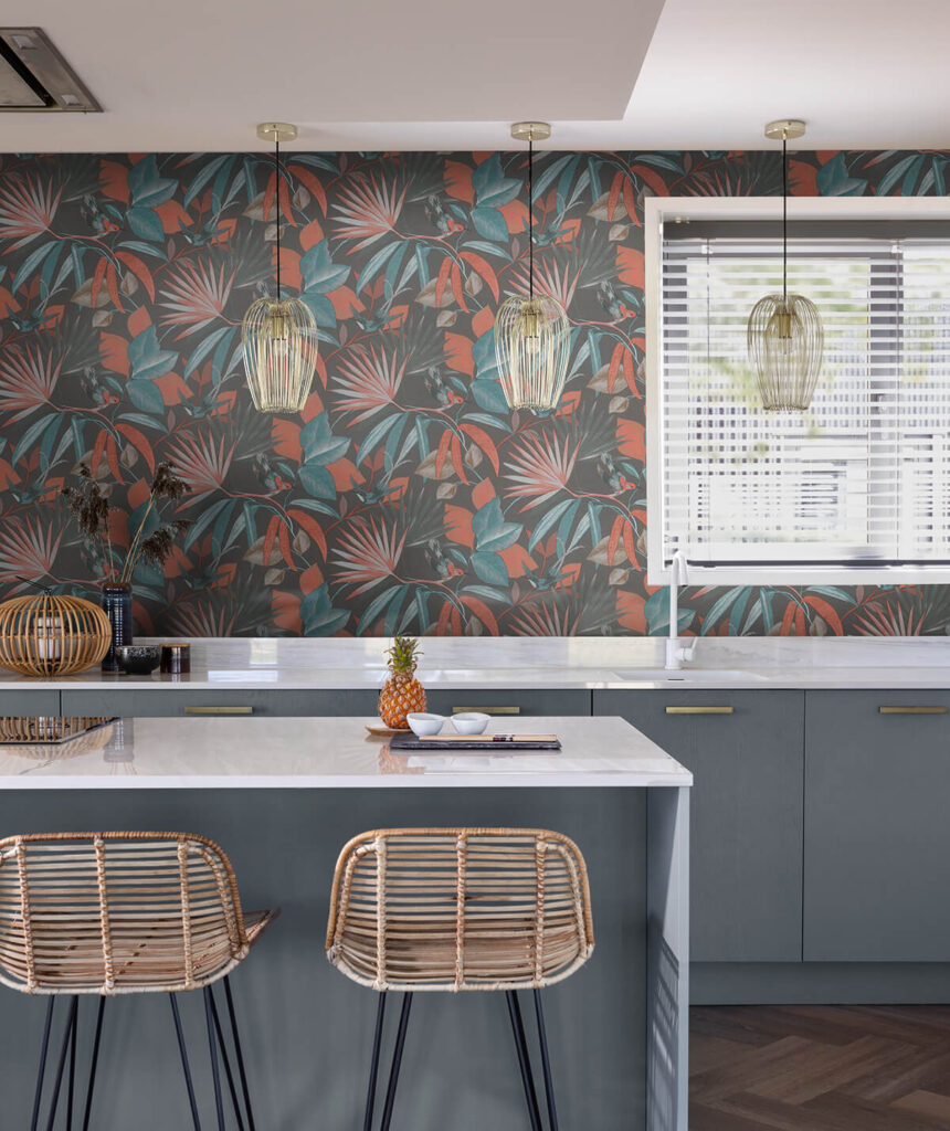 Cotton White-Natural White, Cotton White-Multicolored, Caramel-Stone, Red and Caramel y Blue Jeans-Orange. El diseño es especialmente exótico sobre un fondo de color antracita en vibrantes tonos petróleo y rojo.