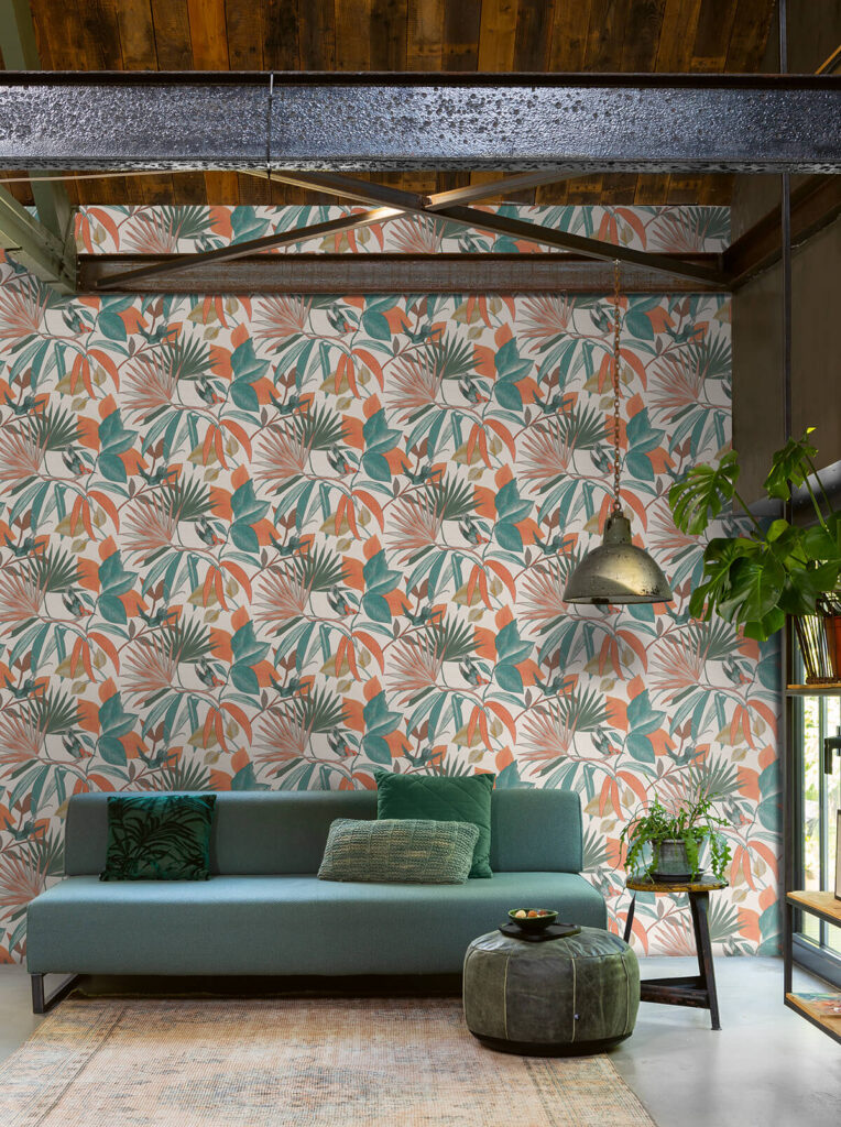 Cotton White-Natural White, Cotton White-Multicolored, Caramel-Stone, Red and Caramel y Blue Jeans-Orange. El diseño es especialmente exótico sobre un fondo de color antracita en vibrantes tonos petróleo y rojo.