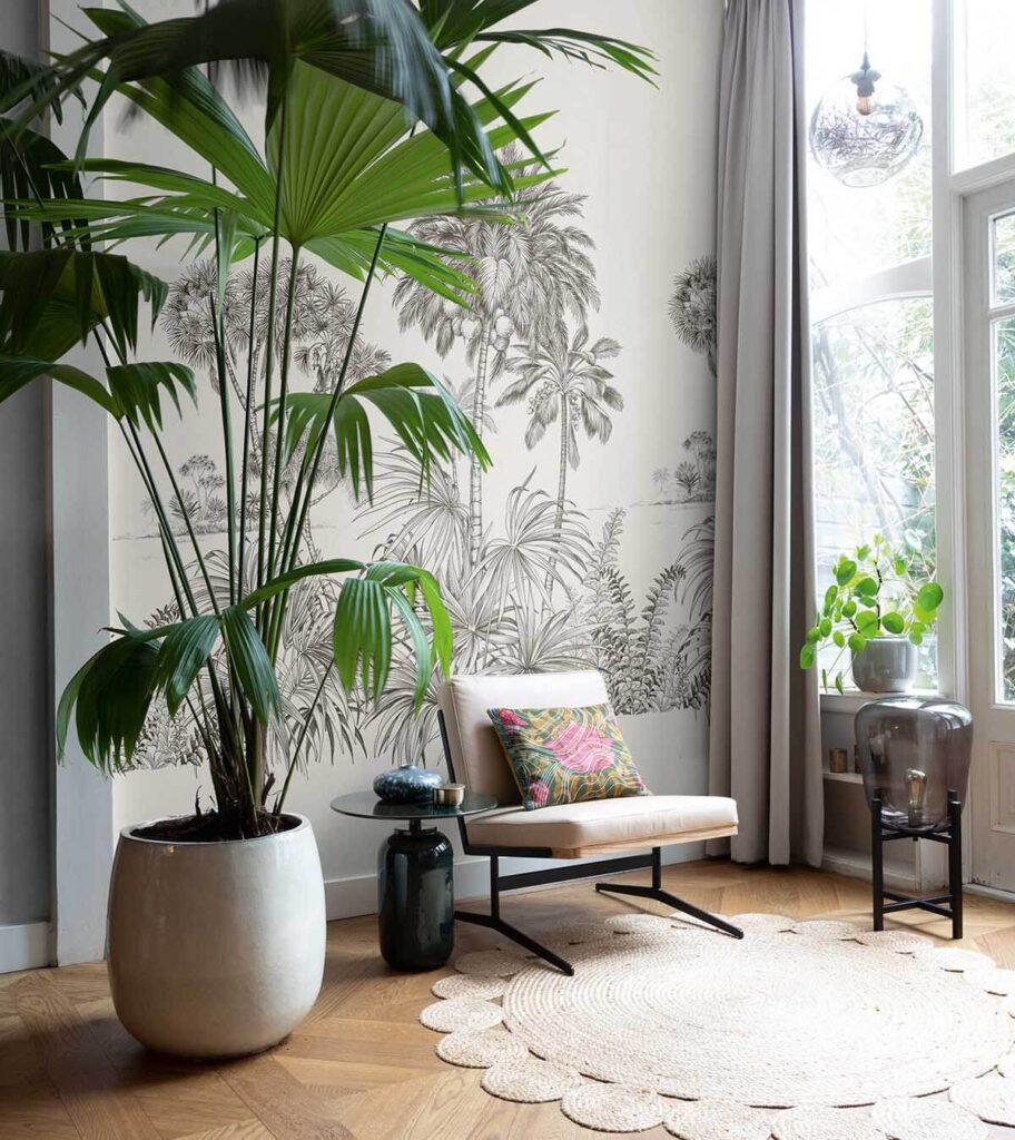 De las altas copas de las palmeras cuelgan cocos maduros y bajo ellos crecen numerosas plantas de hojas tropicales. A lo lejos se puede ver el idílico paisaje de los mares del Sur, tan típico de la isla samoana de Upolu. El paisaje en tonos negros y grises del papel pintado impreso digitalmente se integra discretamente en el entorno en cuanto a color, pero con un motivo impresionante. Solo falta la hamaca…